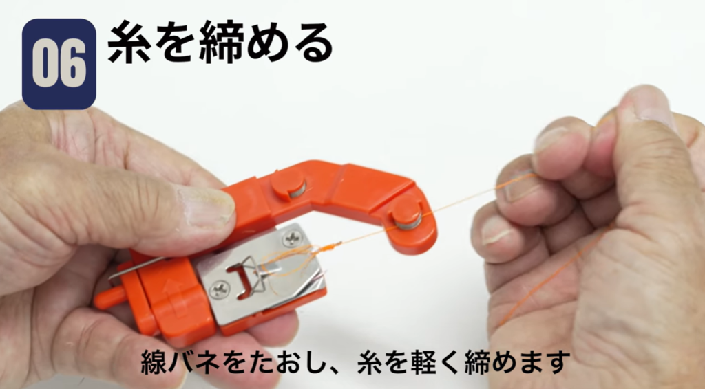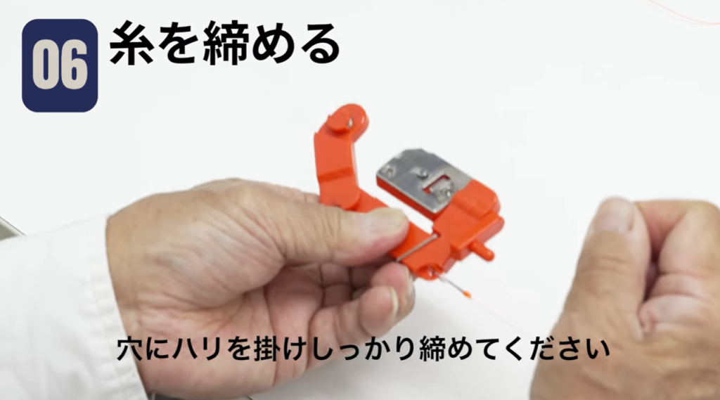 トルネーダ針結びの下部にある穴に針を掛けて、きつく締めましょう。