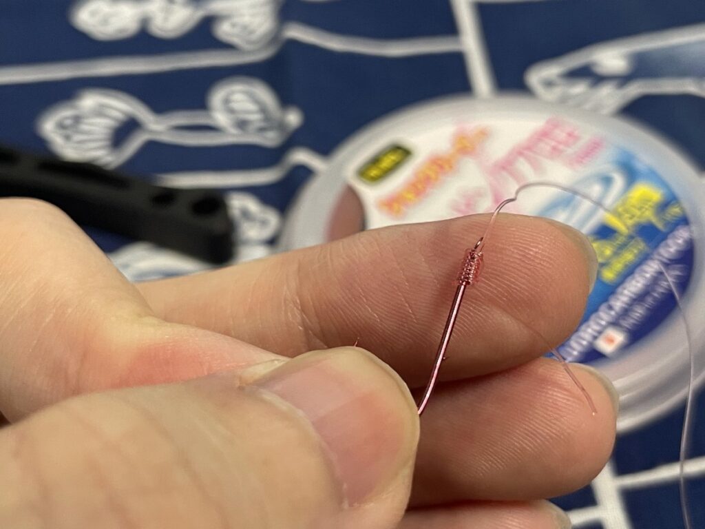 個人的には針をどのポジションに設置するのか分からず、ハリスをクルクルやっているうちに針が倒れてきたりとなかなか苦戦しましたが針を奥までしっかり挟んで固定すれば動かないんだー!と気がついてからモリモリ作りました。