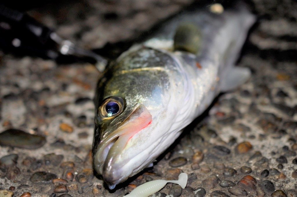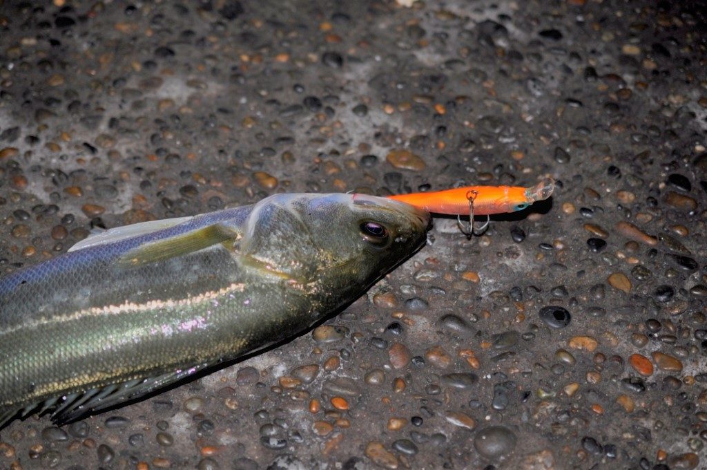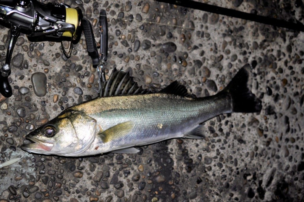 私がさっき釣ったシーバスよりも数㎝大きいシーバスを釣り上げた。ハードルアーって釣れないイメージがあったけど、釣れるもんなのね