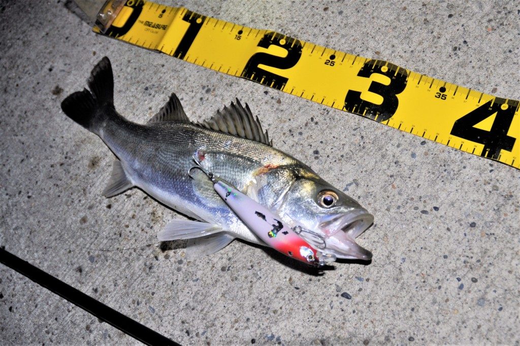 シーバス(37㎝)だった。今回のはルアーの後ろフックにかかっていた。良い引きで楽しかった。