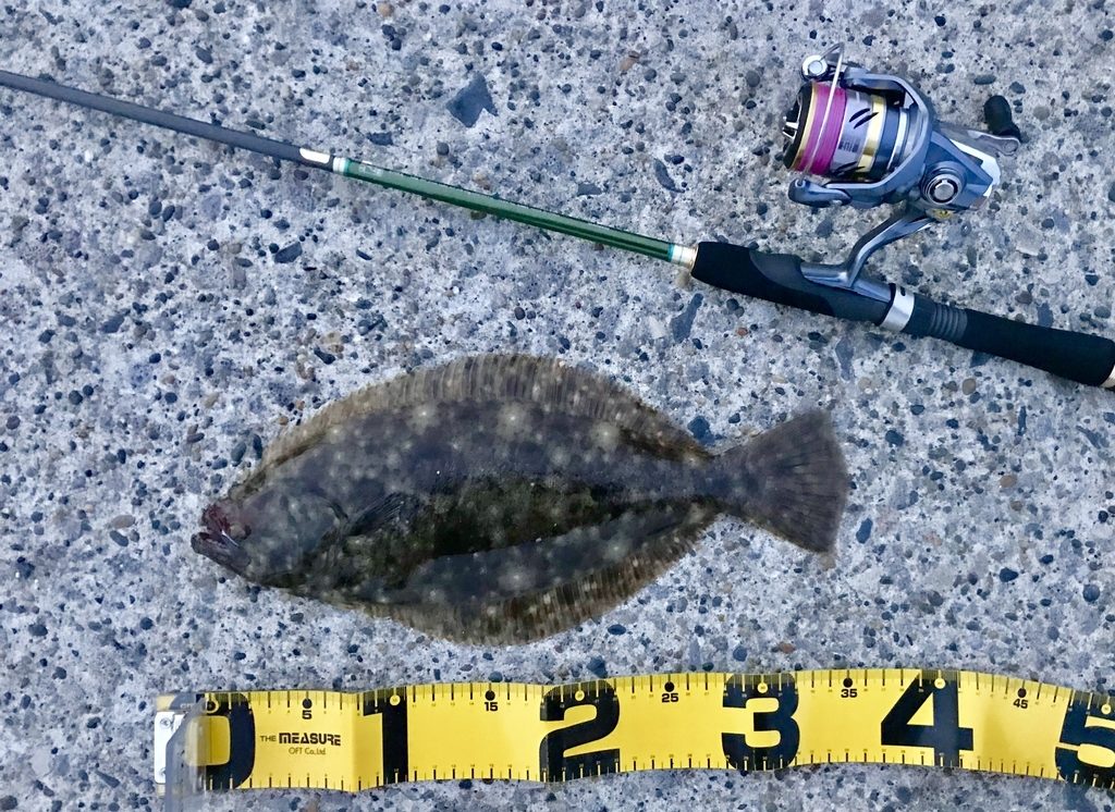 ヒラメ(35㎝)。ソゲとも呼ばれているヒラメの幼魚だそうだった。なにうえあんなに引きが強かったのか考えた。おそらく使っていた竿が7.6フィート(2メートルくらい)でリールが2000番台のリールだったからかなぁ。