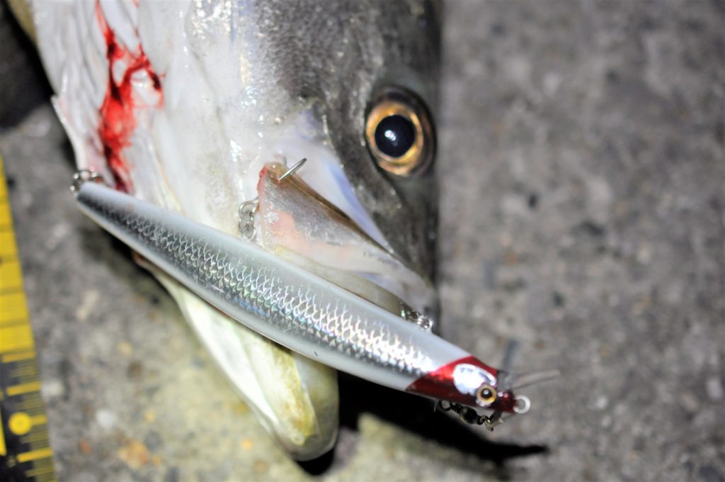 ルアーのフックは3つ中 3つともスズキの口元にガッチリとかかっていた。流石 私のエースルアー サイレントアサシン!お高いだけあるぜ!!