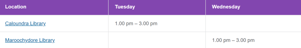 いちおう、私が調べた限りですと、サンシャインコーストにある図書館の中では、ここマルーチドア(Maroochydore)図書館とカランドラ(Calaundra)図書館で週に一回のみ開催されているようです。