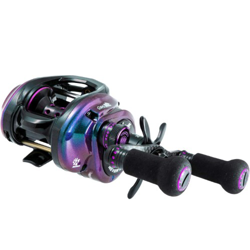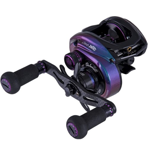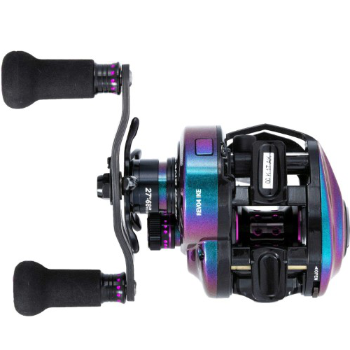 特徴的なカラーリングとハンドルノブ搭載したREVO「アイク」です。北米BASSトーナメント参戦のマイクアイコネリの生んだシグネチャーモデルであり、選べるギヤ比(2タイプ)で巻物から打ち物までの攻略が可能。フレームとクランクサイドは頑丈なアルミ素材で形成され、高いドラグMAX11kgをしっかりとサポートしてくれます。