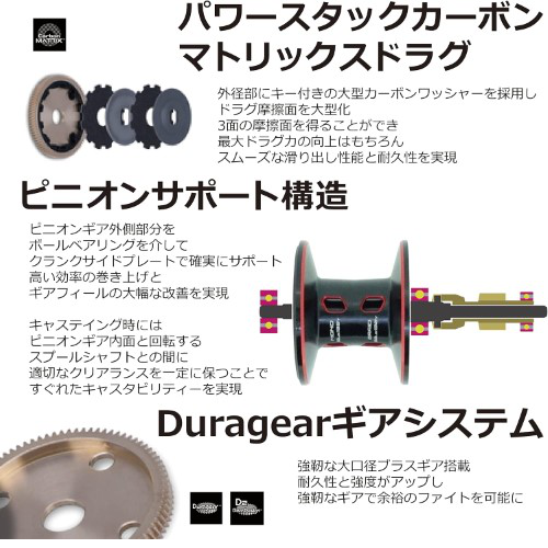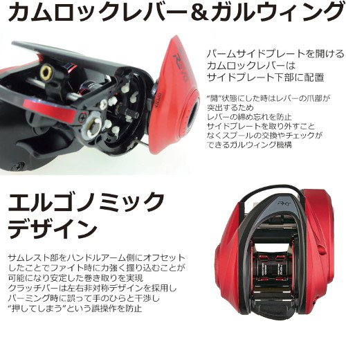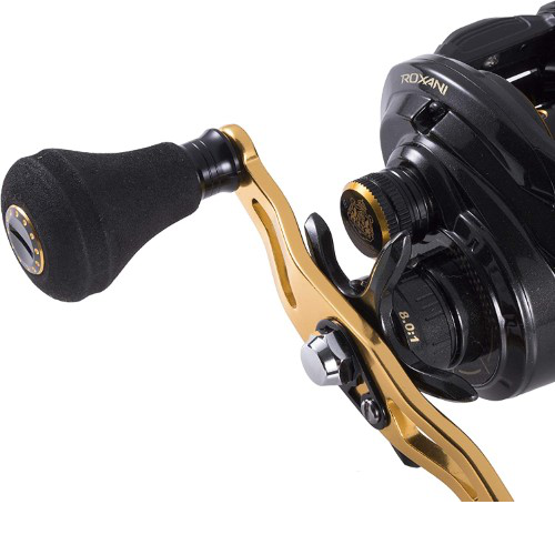 ロキサーニのパワーモデルです。頑強デュラメタルフレームを採用しており、内部のメカをしっかりと支持。ソルトシールドピニオンBB搭載で淡水から海水まで幅広い用途に対応。ディープスプール20lb-100mのラインキャパシティで大型プラグでのブラックバス、そのほかにもシーバスや大型ロックフィッシュに対応できる懐の深さが魅力的。
