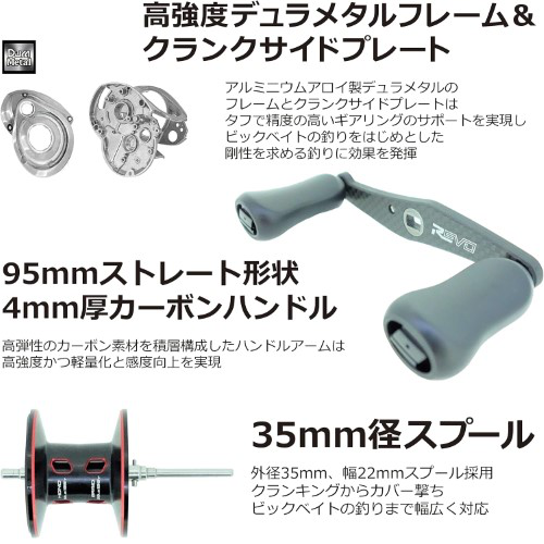第4世代のレボでは飛距離が一番出る!と高評価されているレボ EXD。高回転 スーパーフリーHPCRと35mmスプールで10g-20gのレンジのルアーの遠投性能が向上したこともあり、バス釣りの他 シーバス相手にも良く使用されています。とにかく飛距離を重視する方におすすめ。