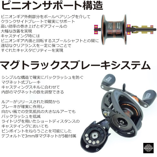 リーズナブルな価格のフルサイズREVO シリーズです。ルアーがリリースされた瞬間からブレーキが確実に効くマグネット方式のMagtraxIIIブレーキシステムを搭載しているため、風が強いオープンエリアでもバックラッシュせずに快適に使えます。