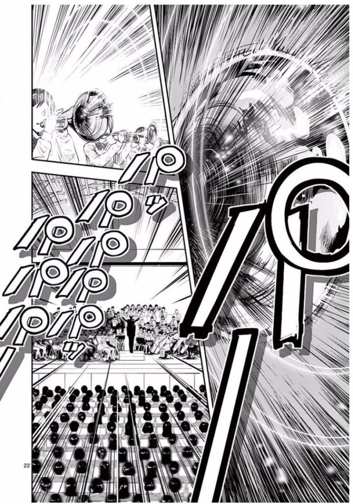 最初の金管楽器(トランペット)の、このコマ以外は音を表すオノマトペが全然 使われずに激烈な演奏を表現していた6話は圧巻の一言だった。
