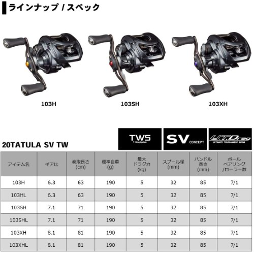 2gから55gまで投げられるTHE万能ベイトリールのタトューラSV TWです。執筆時現在では数あるタトューラの中でも屈指の自重の軽さを誇り、ロックフィッシュからシーバスなど、果てはベイトフィネスのような様々な釣りモノに併用されている名作リールです。足元で5g程度の軽量ルアーまで操りたいなら、軽量ルアーも含めたバーサタイルな使用ができるタトゥーラSV TWがおすすめです。