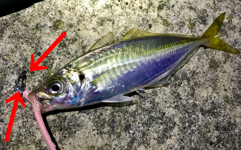 と心配に思う方もいるかもしれませんが、大丈夫です。そもそもフックの方が大きいので、そこまで目が良ければルアーを使ってる時点でアウト。上の画像で分かる通り、釣れるときは考えナシでつけたパワーイソメ(極太)でも釣れます。