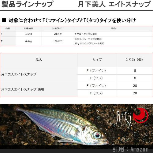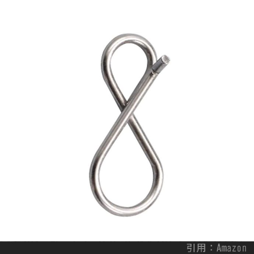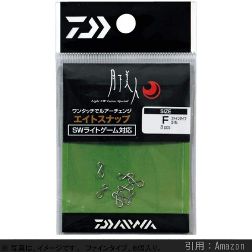 耐久力が強い(T)DAIWAの『エイトスナップ』です。名前の通り、八の字のカタチをしたスナップ。慣れたら着脱が非常に簡単でスピーディに行えます。タイプはFとTの2タイプありますが、デカメバルの抜き上げを検討している方にはT(タフ)タイプがおすすめです。