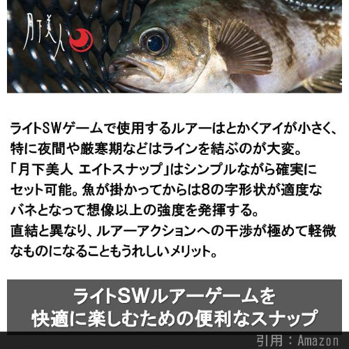 現在 筆者が愛用しているのが月下美人のナインスナップです。スライド式となっており、寒い日かじかむ手でもルアーの脱着がかんたん。20㎝後半の大型メバルを抜き上げても問題ありません。