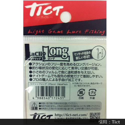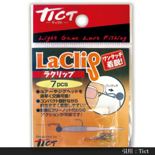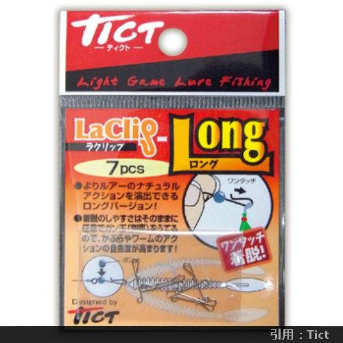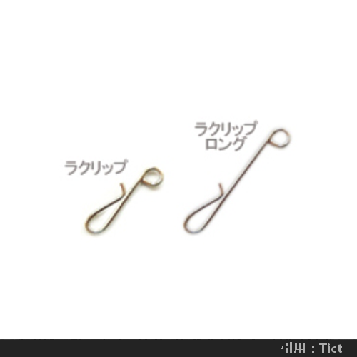 ルアーの付け替えが非常に簡単なTict『ラクリップ』です。コンパクト設計で魚に違和感を与えづらく、ジグ単の泳ぎを阻害しません。ナイトゲームでも指先の感覚だけで着脱しやすく、釣り場状況の変化に応じて素早い交換が可能です。さらに持ちやすく着脱簡単なロングタイプがアジングには相性が良く、ガン玉などを使うことにより重さ調節も可能になっています。