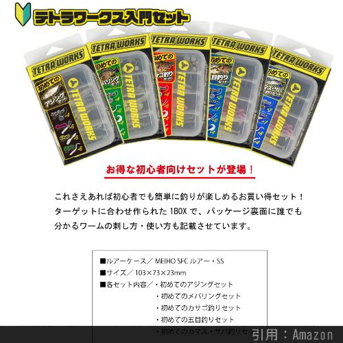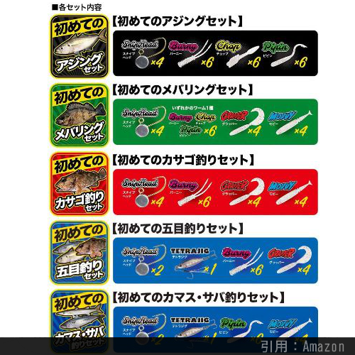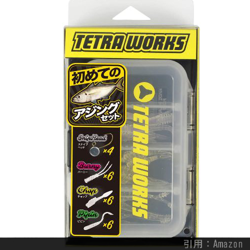 ジグヘッドが付属、ワームが3種類(合計18本)入った初心者におすすめのアジング入門セットです。コストパフォーマンスが非常に高く、執筆時現在は1000円前後という安さ。パッケージ裏にワームの刺し方なども指南されており、釣り場でスマホを操作することなくアジングに集中できます。