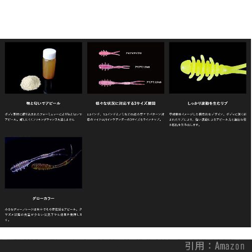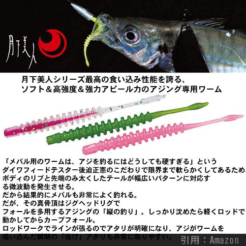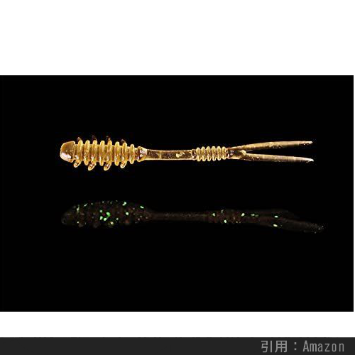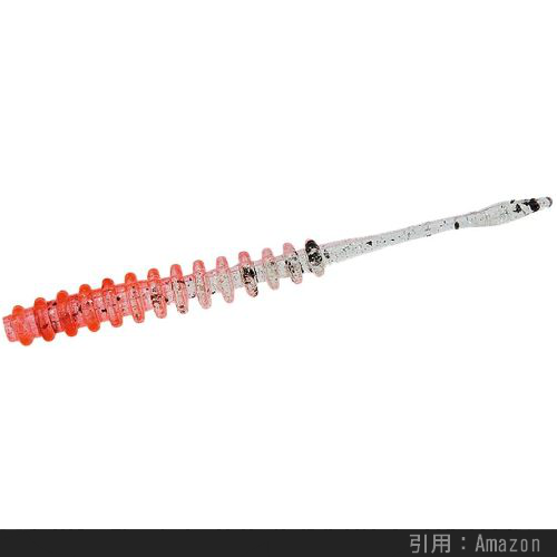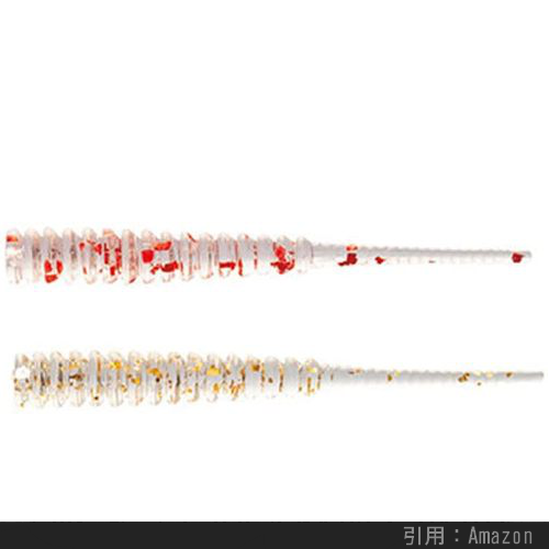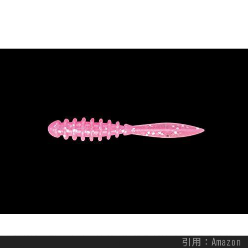 ついばむようなアタリや障害物との接触でもワームがズレにくく、フグなどに噛まれても切れにくい高強度のマテリアルが使われています(まぁ切れますけどね…)。頭部をやや絞ったことで水流がワーム表面をスムーズに流れ、リブボディと相まって波動を発生→アジにより強烈にアピールします。DAIWAブランドの中でも特に歴史の深いアジングワームです。