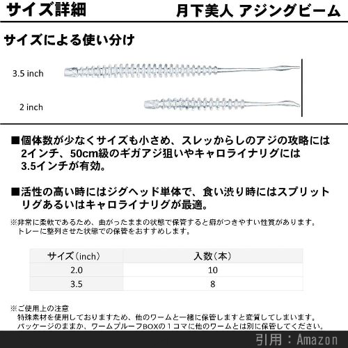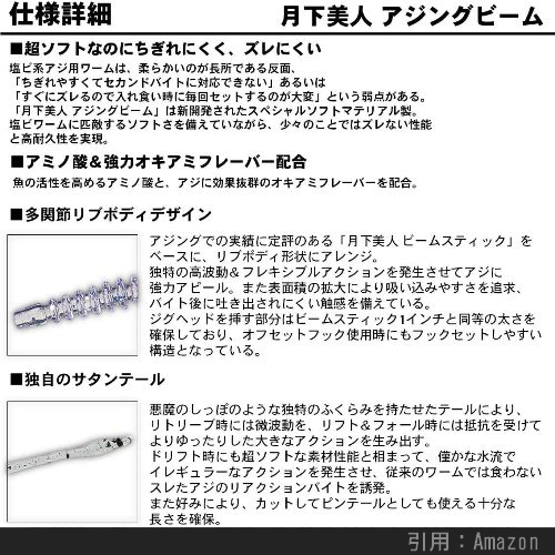 カラーに合わせて2種類(イカ・エビ)の集魚剤が内蔵されており、アジの釣果が非常に高いビビビームです。パドルテールも極薄(0.6㎜)なので豆アジの吸い込みを妨げ難くなっています。セットする向きで波動が変化するのも特徴。フォールスピードを自在にコントロール可能だったりと、出来る事が非常に多いワームです。