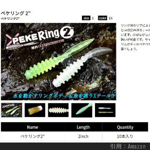 アジが好むという「味と臭い」、従来のソフトルアーよりも海老オイルが多く練り込まれたペケリングです。海老オイルをさらに追加し、効果をアップさせました。ボディにリング状のリブを採用したことで、生み出す波動・高アピール力を誇り、Xテールでアジの捕食本能を刺激。サイズは2インチがおすすめです。