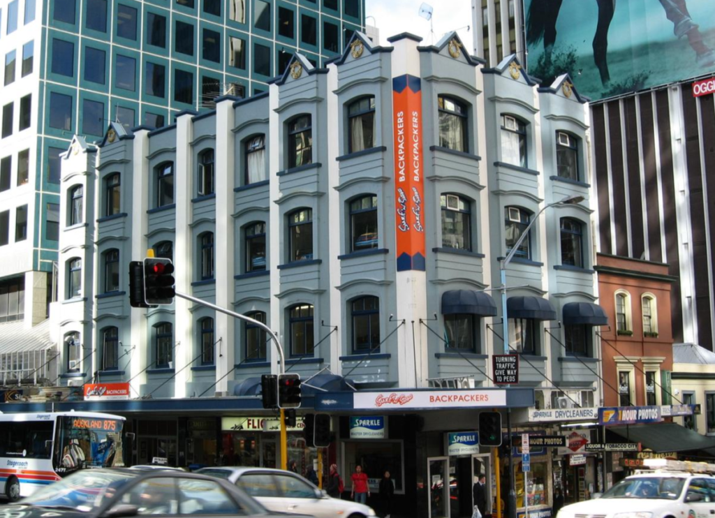 今回 紹介させていただくのは表題の通り、オークランドのシティ、それもスカイタワーから300メートルほどに位置している、サーフ アンド スノー バックパッカーズ (Surf 'N' Snow Backpackers)というバックパッカー宿です。