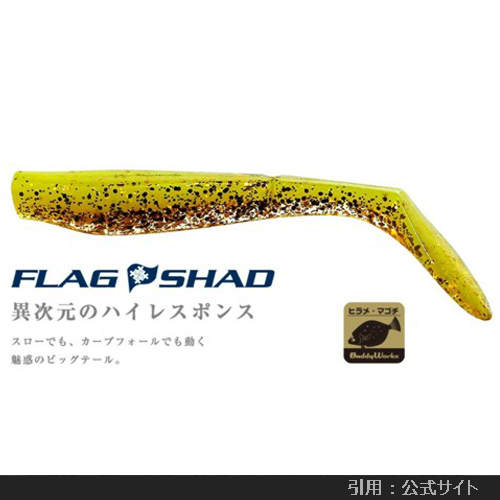 ということから、魚の活性の高い時期に投げると一発で釣れるコトの多いルアーがバディワークスの『フラッグシャッド』というルアーになります。後述しますが、尻尾がデカいのでスローに引いてもフリフリッ!と尻尾を大きく振って泳ぐので