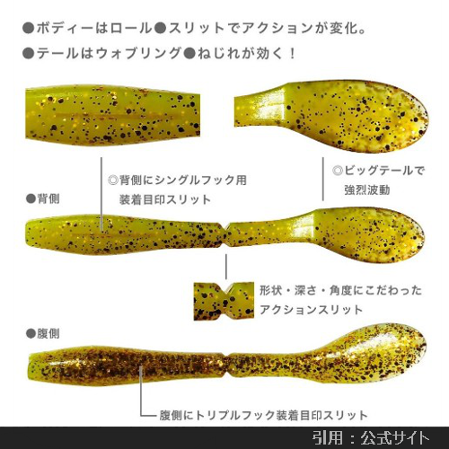 大きな尻尾と平面ボディによって高い波動とフラッシングを獲得したニュータイプのシャッドテールワームです。安定してナチュラルかつハイピッチなローリングアクションを繰り出し、かつ他のシャッドテール系ルアーとは異質の波動を生むことでバイトを誘発します。ヒラメの実績多数有り。