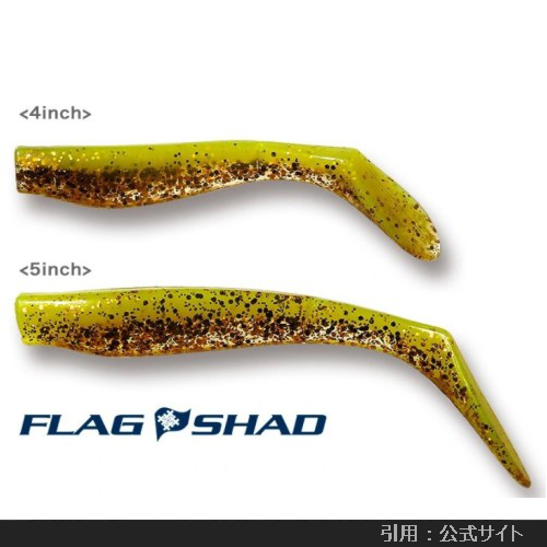 実際、アクションとしては『かなり強め』に分類されており、テールが激しくうねっては強い波動を生み出してくれます。ボディはロール、テール(尻尾)でウォブリングとなっており、活性の高い時なら着底と同時に魚が付いている、というコトも少なくない遊泳力の強さがフラッグシャッドのおすすめポイントでしょう。