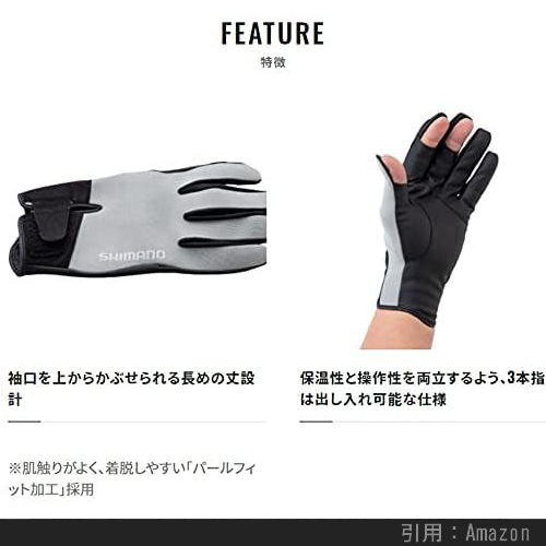 使用頻度の高い3本の指部分を出し入れ可能な仕様とすることで、通常時は保温性を優先、タックルの交換時には瞬時に指先を出して作業できる利便性を追求したモデルです。心地よい手触りでのパールフィット加工を施したことで着脱も容易、袖口はウェアの袖の上からかぶせられる長めの設計で、冷気や水の侵入を防いでくれます。機能性と操作性の両立を目指すアングラーには特にオススメです。