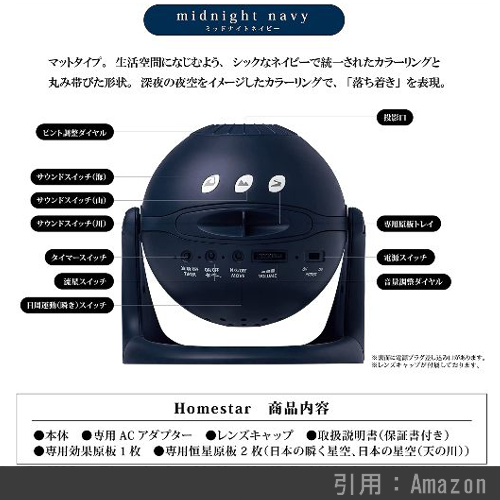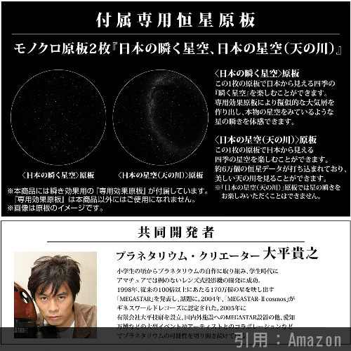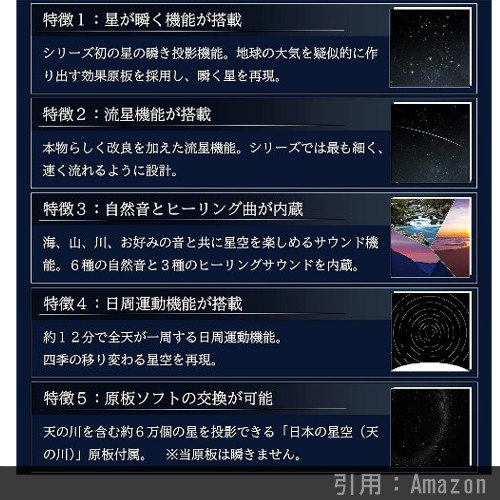 - 肉眼で見える星数を超えた業務用並の約6万個の投影機能が搭載