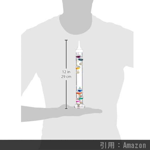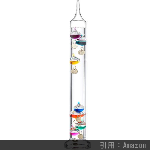 ガリレオ・ガリレイの発明した比重測定原理に基づいて設計された『ガリレオ温度計』。気温の変化により、内部の液体の密度が変化し、色とりどりの球体が上下に移動します。球体には金色のタグがついていて2℃刻みで温度が刻印されています。おしゃれなインテリアとしてだけではなく温度計としても使えておすすめです。