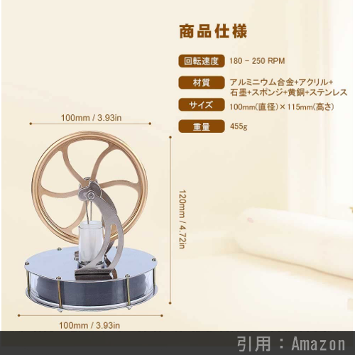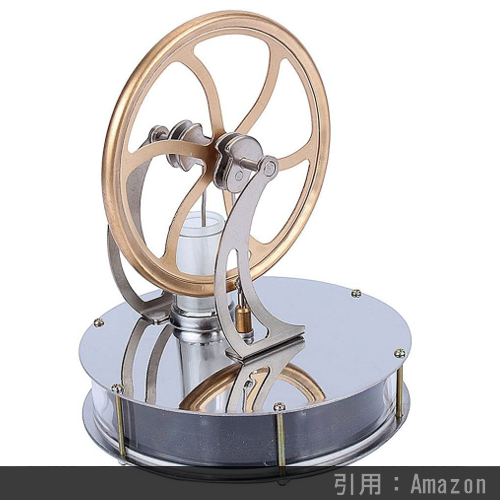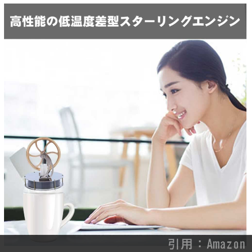 ホットコーヒーや冷たい氷水などの上に置いて温度差生じさせ、手で少しだけホイールを回転させると勝手に回り続けるスターリングエンジンです。小さな機械が一生懸命動作している様子は、可愛らしく、癒やされるというレビューも多く、大人の『ちょっと変わった』インテリアとして面白いです。カップ麺の蓋上で待ち時間を楽しむのにも良いでしょう。