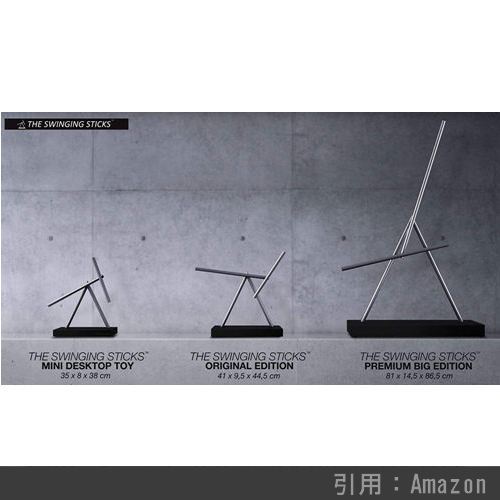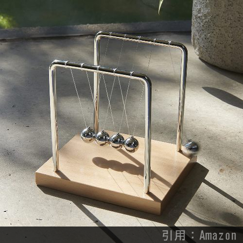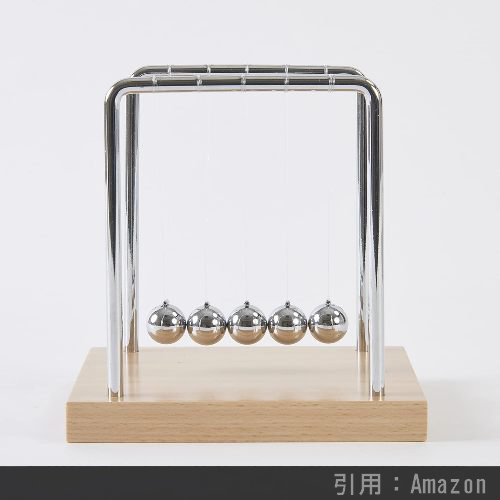 仕組みは簡単なので類似品が超多い『ニュートンのゆりかご』系アイテム。その大半は台座が脆かったり球を吊るす糸が破断しやすかったり中で、30秒以上もカチカチが続く良品です。