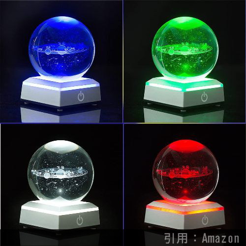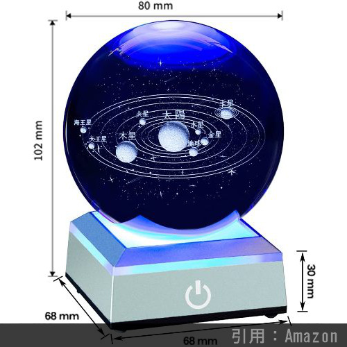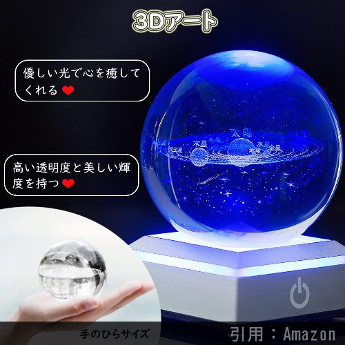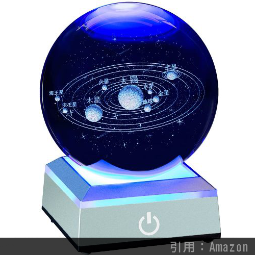 3Dレーザー彫りによる太陽系のクリスタルボールです。煌めく星の海、太陽を中心にして惑星が名前付きで配置されており非常に精巧に仕上がっています。四方面、上下から見ても立体的に見えます。豆電球一個なので電池のもちも良いのもおすすめポイント。