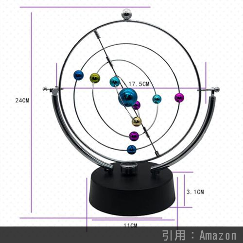 優雅にくるくるくるくると回り、睡眠を誘ったりもする機能性もあるインテリアです。永遠に続くような二重振り子の回転と揺らぎは、映画「アイアンマン2」に登場したオリジナルサイズのそれとほぼ同等。単三電池4本で最大3か月間動き続けます。卓上タイプ、デスクトップサイズ等 いろいろなサイズがありますので用途に合ったサイズを選びましょう。