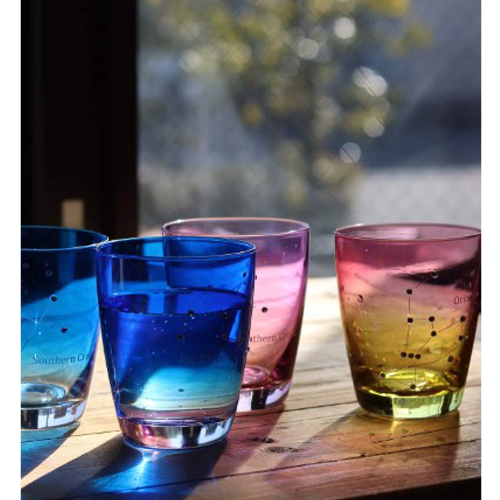 グラデーションが美しい星空で有名な星をモチーフにしたグラスです。朝焼けの中のイメージと夜のイメージの2パターンあり、お好みや気分に合わせてお選びいただけます。ちょっと大人にしっぽり飲みたい時は夜の星座を。ちょっと小洒落た気分の時は朝の星座を。