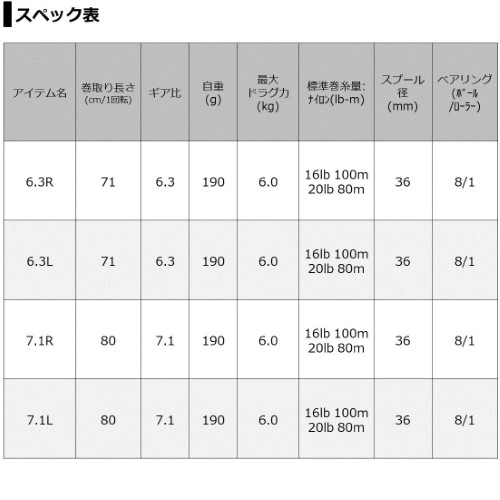 | ナイロン糸巻量(lb-m) | 16-100 20-80 |