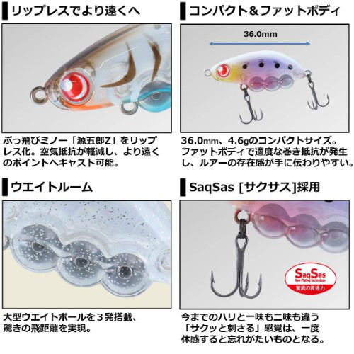 空気抵抗となるリップがないことに加え、36mmコンパクトボディにクラス最大級となる大型ウエイトボールを3発搭載したことで驚きの飛距離を実現。今まで攻略できなかった沖の潮目や大型メバルが潜む遠浅のゴロタ場を攻略することが可能となった。アクションは源五郎Zとは異なる頭を支点としたテールスイングアクション。ただし、一般的なシンキングペンシルだと巻き抵抗が小さくノー感じになりがちだが源五郎リップレスはボリューミーなファットボディの為、適度な巻き抵抗が発生し、ルアーの存在感が手に伝わりやすい。また、重量級ボディながらも浮き上がりが早いため表層攻略も可能。類い稀なる遠投性能と様々なレンジへの対応能力で難攻不落のデカメバルを攻略してほしい。