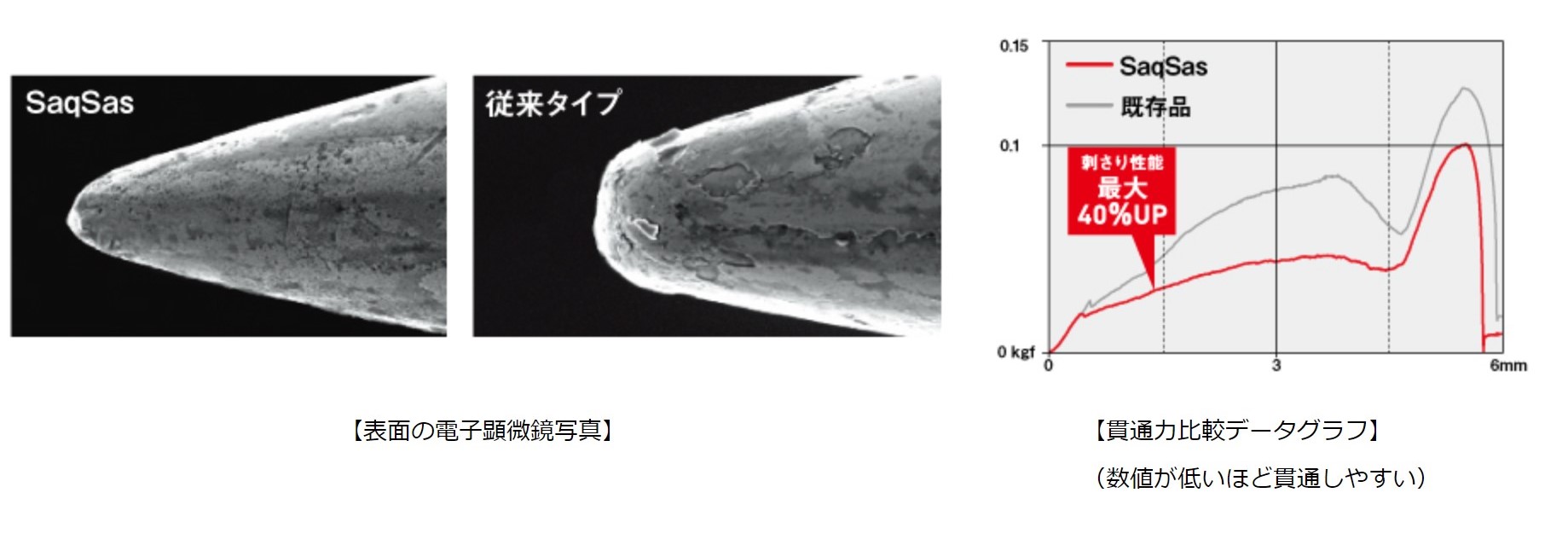 ハリの表面にフッ素系特殊プレーティング加工を施すことで、刺さり性能は従来の塗装ハリに比べて最大40%(平均約20%)アップ(当社比)。