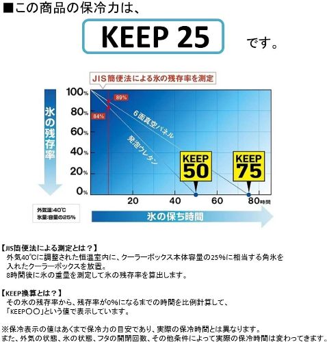 『KEEP』はJIS規格(JIS S 2048 : 2006)の簡便法に基づいて氷の残存率を算出。更に氷が溶けきるまでの時間に換算して「KEEP○○」という値で表現しています。ダイワでは断熱材によって保冷力が結構違います。