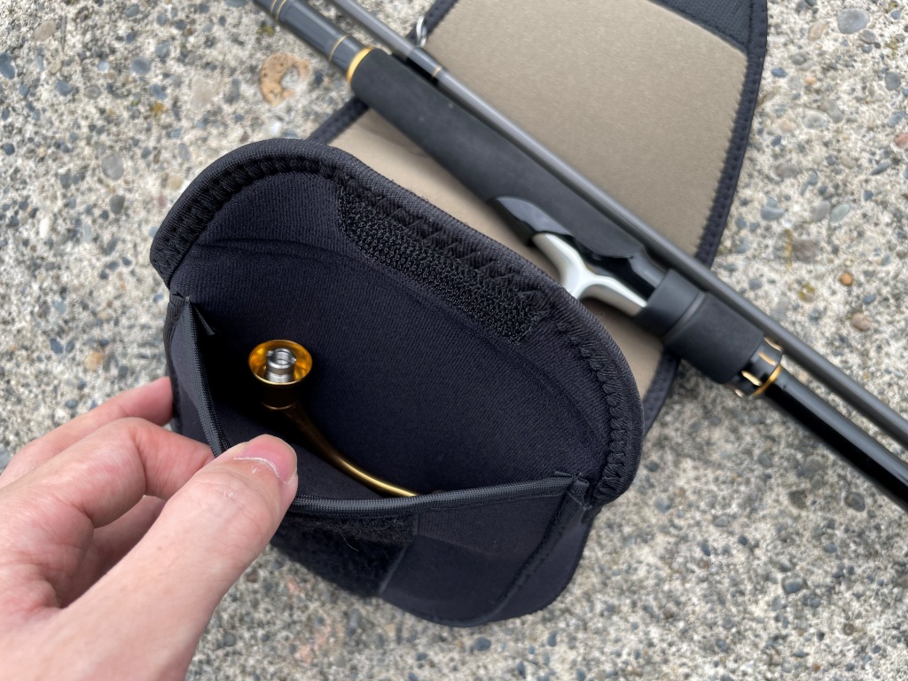 まず、今回購入してみたのはスピニングリールのハンドル等を収納可能なポケット付きのネオリールカバー SP-Hシリーズです。素材はクロロプレンを採用しており、厚手(5㎜)でクッション性能抜群。柔軟性もあるので、ランガンの際に極力 荷物を少なくしたい方に強くオススメしたいリールケースです。