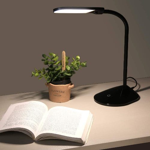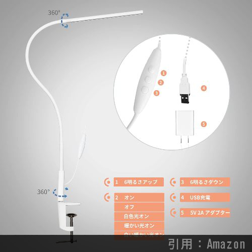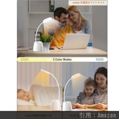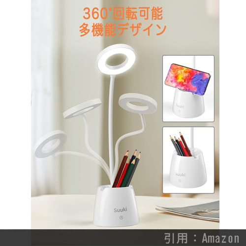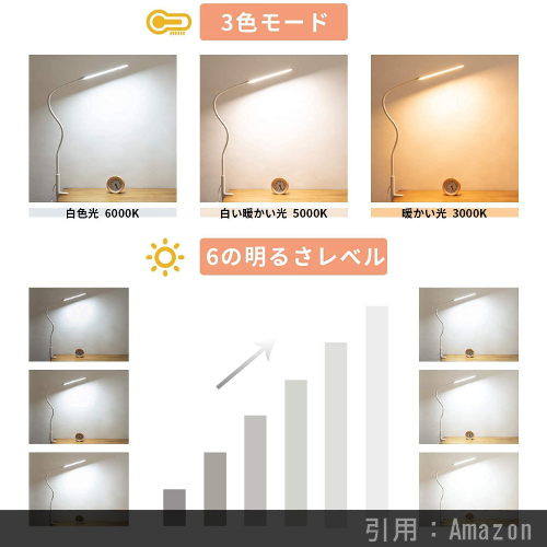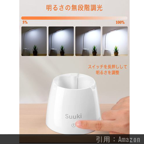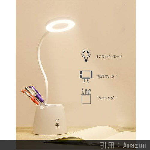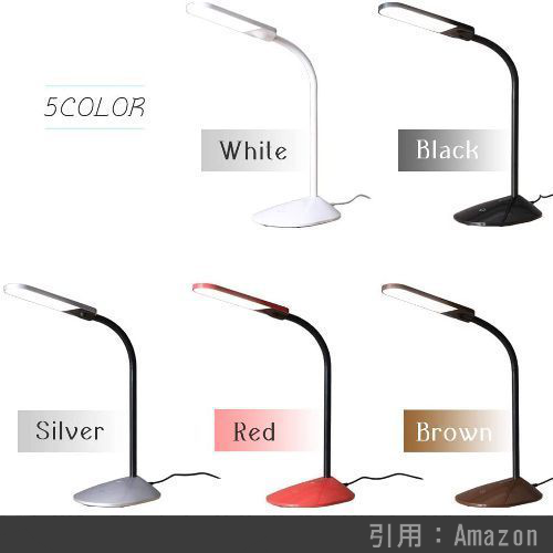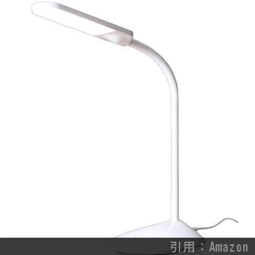 色温度は3段階、光量は無段階調節が可能なLEDデスクライトです。非常に安価ですが、明るさは最大6000Kと申し分なし。持ち運びを考慮してか本体が軽量になっているので、スタンドの部分(ペンホルダー)のところにアイテムを入れると安定感が増すようです。