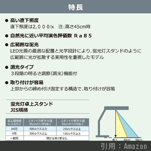 特筆すべきは『照らす範囲』の広さ。しっかりとしたJIS規格に則ったLEDデスクライトです。明るさも6200Kと十分なスペックを誇り、小さな文字もしっかりと見える『文字くっきり光』も搭載。どんな角度にも合わすことが出来て、アームにも高さがあるので前後左右ベストポイントに動かすことも可能。
