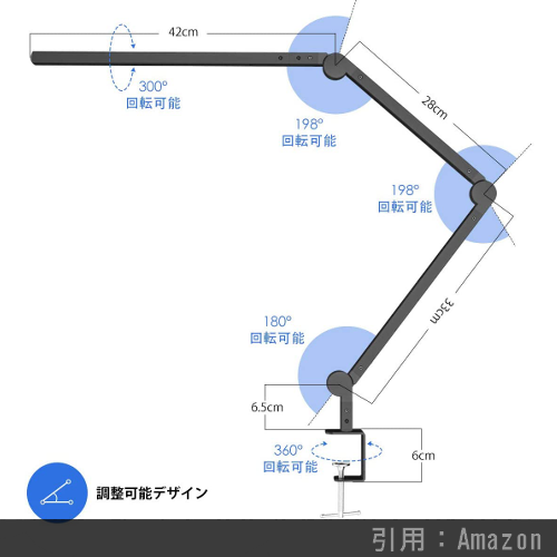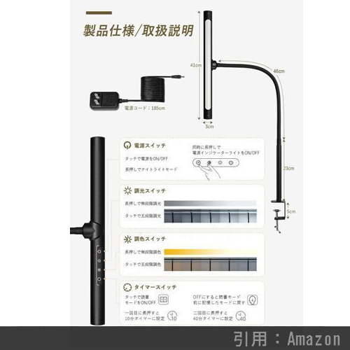 ヘッドの部分は上下左右に300度回転して、アームを自由に動かして光の向きを調節できます。 - 10分、40分タイマー設定