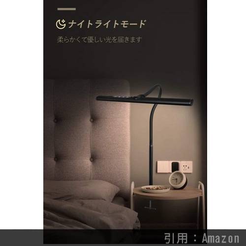 暖色の2700Kから小さい文字もしっかり見える6500Kまでと、広範囲の光量調整が可能です。読書モードとナイトライトモードも搭載されており、読書に最適な4000K色温度と100%照度のモードに設定することで学習机や読書灯として目に優しいスタンドライトにもなります。アームの可動域が長いことから、PCの後ろに設置して手元を照らしたいという方にもおすすめ。