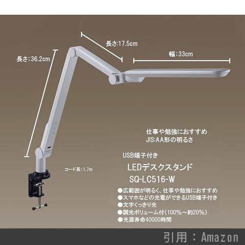 - 3位:パナソニック LEDデスクライト クランプ型 SQ-LC516-W