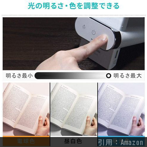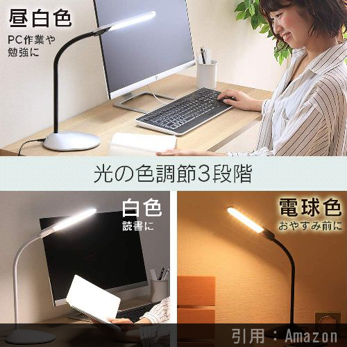 先述したアイリスオーヤマ『LDL-QLDL』よりも簡単な操作性で十分な性能を誇るデスクライト『PDL-101』です。PC作業や読書に最適な『昼白色』、リラックスタイムに最適な『電球色』、やわらかい光の『白色』など必要な機能はしっかりと備えおり、価格も3000円を切るほど安価。必要最低限のLEDデスクライトをお求めの方におすすめです。