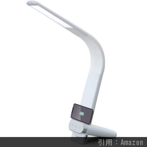 パッと手に取れてパッと戻せるワイヤレス充電にUSBポート搭載。色温度は3段階しか分けられませんが、光量は無段階で調整が可能(最大2000ルーメン)。便利機能も色々とついており、価格も非常に安価。1日5時間使うと仮定しても1か月の電気代は32円程度。コスパの良いLEDデスクライトをお探しの方におすすめです。