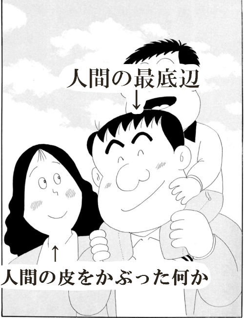 と、ほぼ全員が主人公夫婦の純度の高いドクズさに恐々する珍しい漫画だ。クズっぷりが見事な作品は他にもあるが、"連ちゃんパパ"と"今どきのイケメンサイコパスがヒャッハー!"する作品では日本のホラー映画と海外のホラー映画の如き違いがある。
