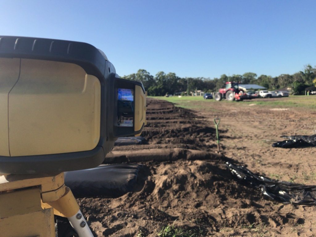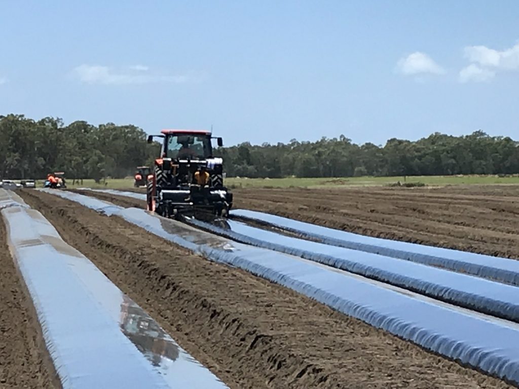 ①耕耘機のような農業車が盛り上がった土の上に黒いビニールテープを敷いていく。