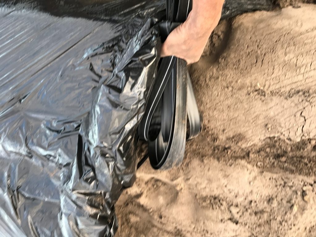 この部分を以外に見落としてしまう作業員が多いらしく、同日に働いていた人たちで何度もお叱りを受けてやり直させられていた。写真のようにしっかりと締めあげて 中心に引っ張って土をかぶせるのが従来のやり方。