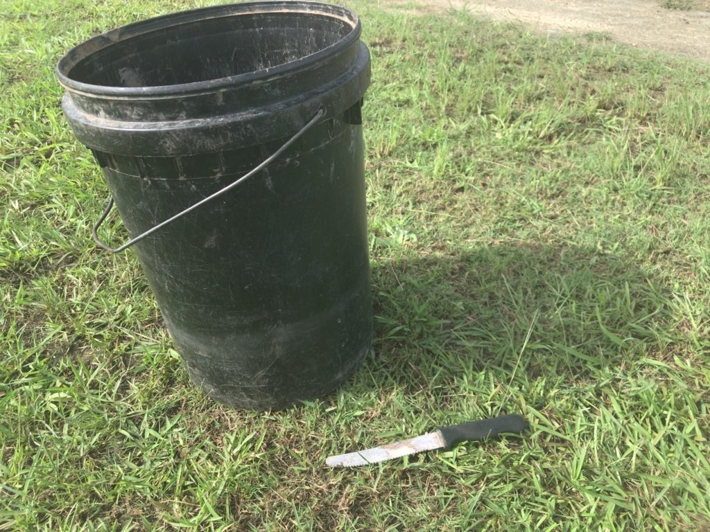 名前の通り、イチゴの葉っぱや茎をカット(切る)作業である。道具は特に必要ない。上の画像のようなバケツとナイフが支給される。