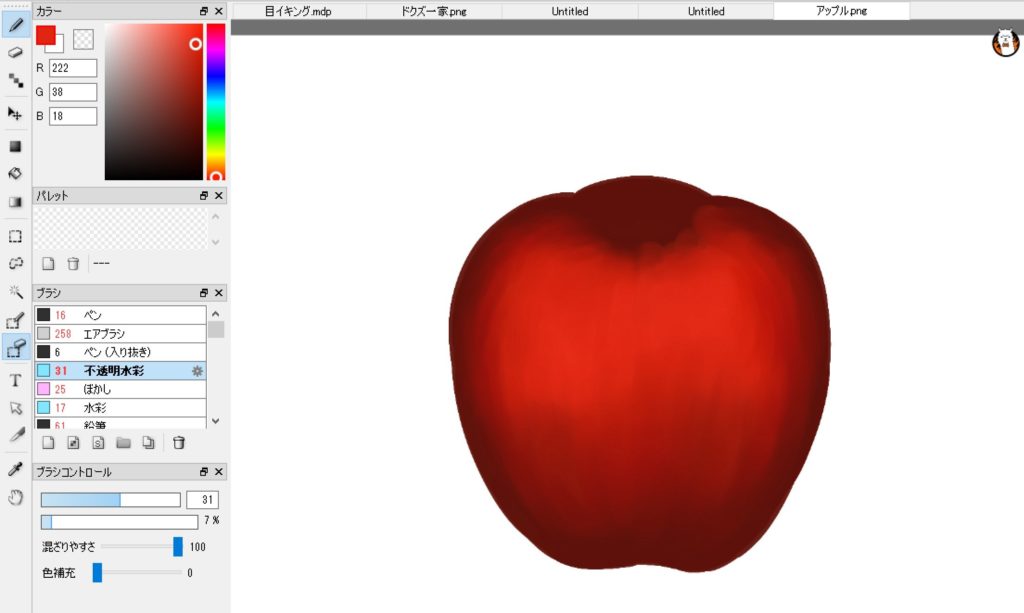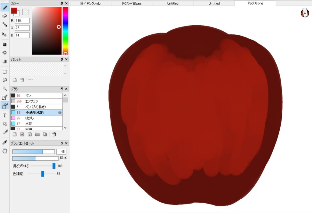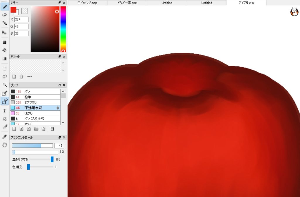 で、最後はリンゴの表面が滑らかになるように、上から下にスッスッと筆を動かすイメージだ。